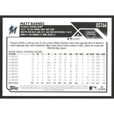 This is a 2023 Topps Update Matt Barnes baseball card. The card is #US166 and pictures show condition.