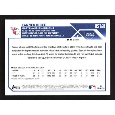 This is a 2023 Topps Update Tanner Bibee baseball card. The card is #US168 and pictures show condition. Team(s): Cleveland Guardians Rookie Card (RC)