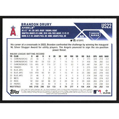 This is a 2023 Topps Update Brandon Drury baseball card. The card is #US22 and pictures show condition.