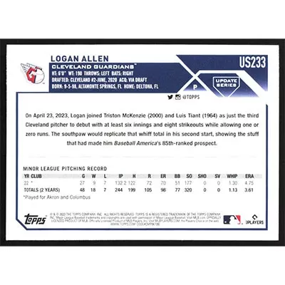 This is a 2023 Topps Update Logan Allen baseball card. The card is #US233 and pictures show condition.