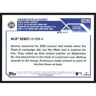 This is a 2023 Topps Update Francisco Alvarez Rookie Debut baseball card. The card is #US255 and pictures show condition. Team(s): New York Mets Rookie Card (RC)