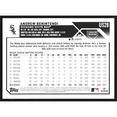 This is a 2023 Topps Update Andrew Benintendi baseball card. The card is #US28 and pictures show condition.