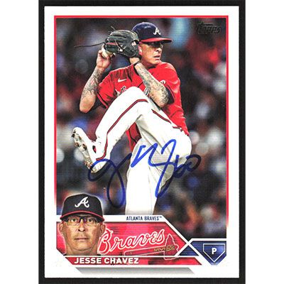 This is a 2023 Topps Update Jesse Chavez autographed baseball card. This card has been signed, in blue, by Jesse Chavez, and is guaranteed authentic by Ballcardz.com. The card is #US65 and pictures show condition.