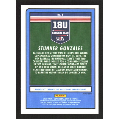 This is a 2023 USA Baseball Stars & Stripes Red White and Blue Stunner Gonzales baseball card. The card is #8 and pictures show condition. Team(s): Team USA