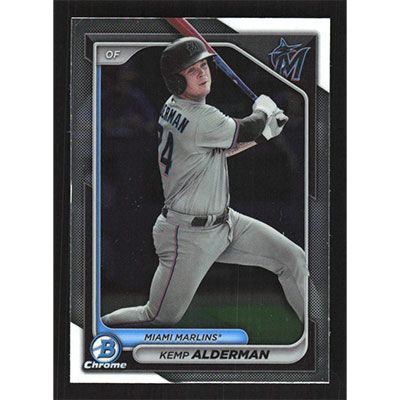 This is a 2024 Bowman Chrome Prospects Kemp Alderman baseball card. The card is #BCP-82 and pictures show condition.