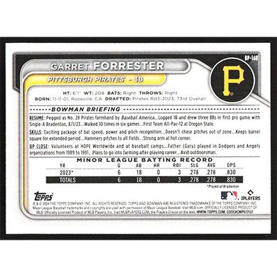 This is a 2024 Bowman Prospects Garret Forrester baseball card. The card is #BP-148 and pictures show condition.