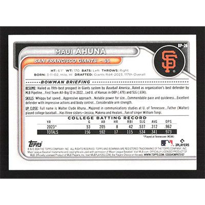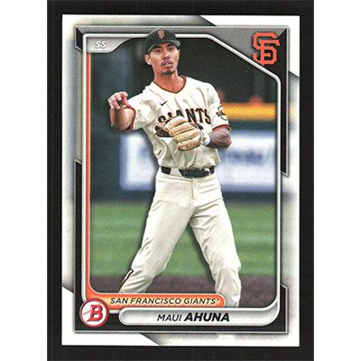 This is a 2024 Bowman Prospects Maui Ahuna baseball card. The card is #BP-26 and pictures show condition.