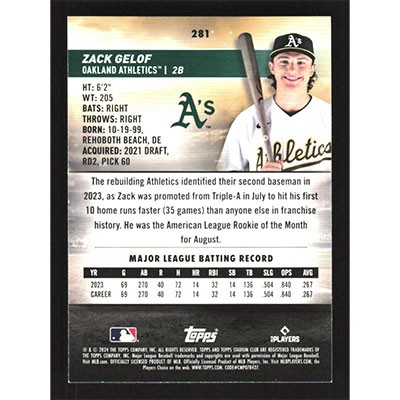 This is a 2024 Stadium Club Pink Foil Zack Gelof baseball card. The card is #281 and pictures show condition. Team(s): Oakland Athletics Rookie Card (RC)
