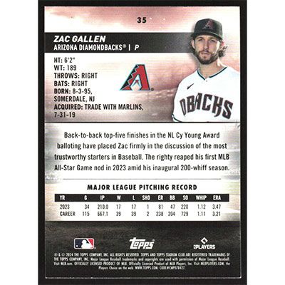 This is a 2024 Stadium Club Pink Foil Zac Gallen baseball card. The card is #35 and pictures show condition.