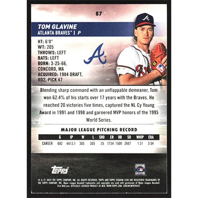 This is a 2024 Stadium Club Pink Foil Tom Glavine baseball card. The card is #87 and pictures show condition.