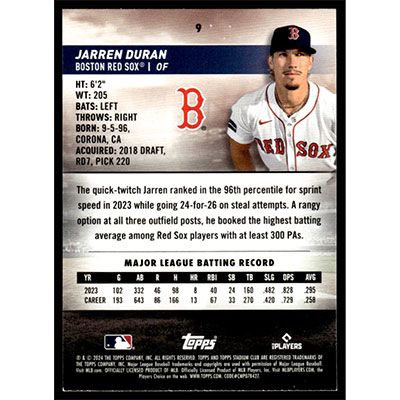 This is a 2024 Stadium Club Red Foil Jarren Duran baseball card. The card is #9 and pictures show condition.