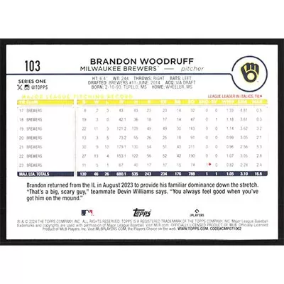 This is a 2024 Topps Brandon Woodruff baseball card. The card is #103 and pictures show condition.