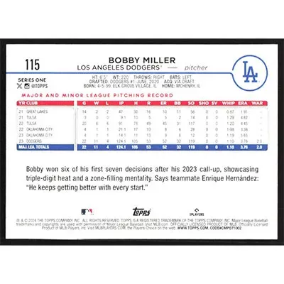 This is a 2024 Topps Bobby Miller Future Stars baseball card. The card is #115 and pictures show condition.