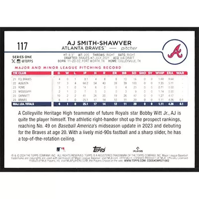 This is a 2024 Topps AJ Smith-Shawver baseball card. The card is #117 and pictures show condition.