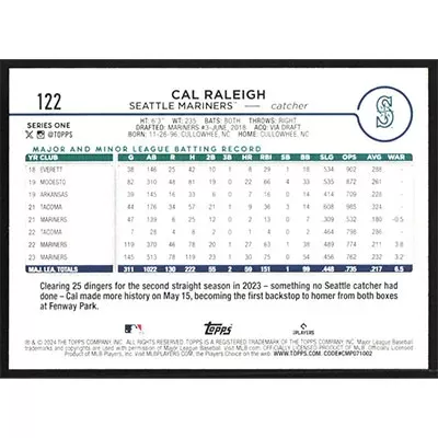 This is a 2024 Topps Cal Raleigh baseball card. The card is #122 and pictures show condition.