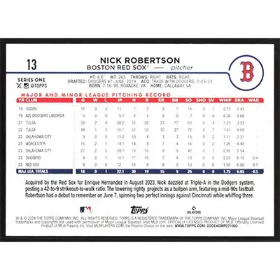 This is a 2024 Topps Nick Robertson baseball card. The card is #13 and pictures show condition.