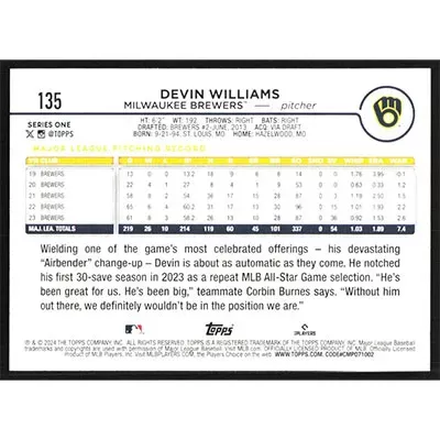 This is a 2024 Topps Devin Williams baseball card. The card is #135 and pictures show condition.
