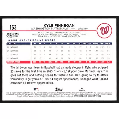 This is a 2024 Topps Kyle Finnegan baseball card. The card is #153 and pictures show condition.