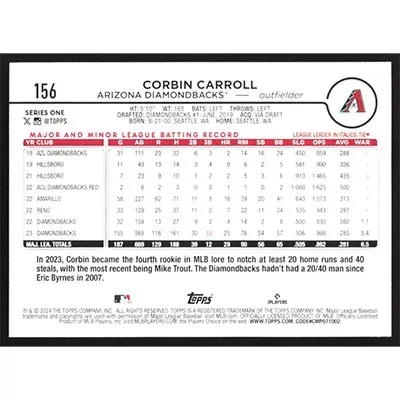 This is a 2024 Topps Corbin Carroll baseball card. The card is #156 and pictures show condition.
