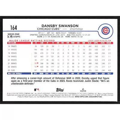 This is a 2024 Topps Dansby Swanson baseball card. The card is #164 and pictures show condition.