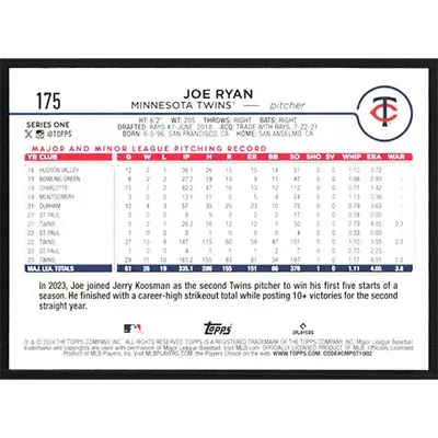 This is a 2024 Topps Joe Ryan baseball card. The card is #175 and pictures show condition.