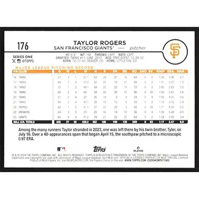 This is a 2024 Topps Taylor Rogers baseball card. The card is #176 and pictures show condition.