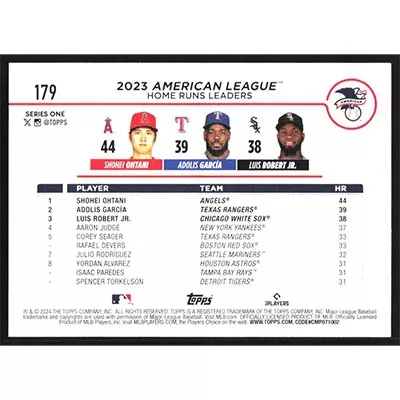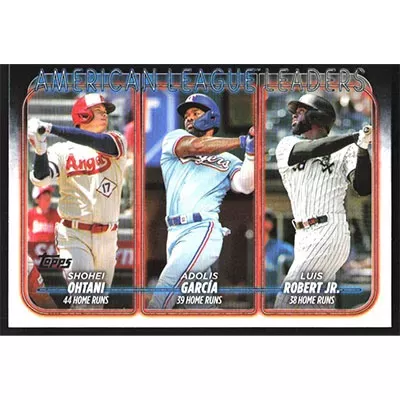 This is a 2024 Topps Shohei Ohtani, Adolis Garcia and Luis Robert Jr. League Leaders baseball card. The card is #179 and pictures show condition. Team(s): Los Angeles Angels/Texas Rangers/Chicago White Sox