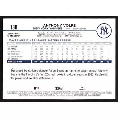 This is a 2024 Topps Anthony Volpe Future Stars baseball card. The card is #180 and pictures show condition.