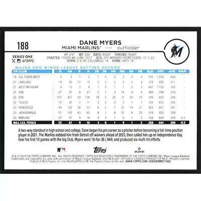 This is a 2024 Topps Dane Myers baseball card. The card is #188 and pictures show condition.