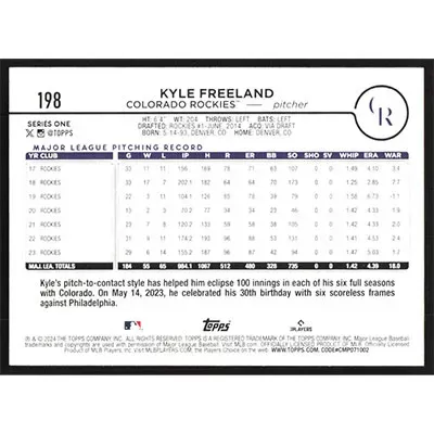 This is a 2024 Topps Kyle Freeland baseball card. The card is #198 and pictures show condition.