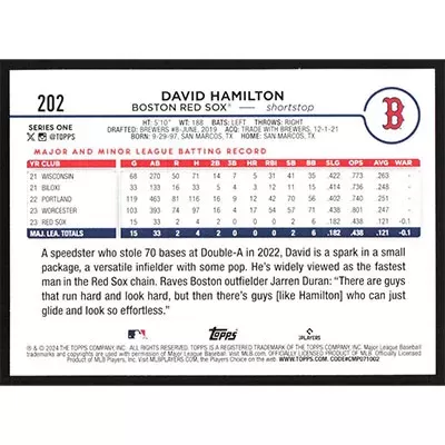 This is a 2024 Topps David Hamilton baseball card. The card is #202 and pictures show condition.
