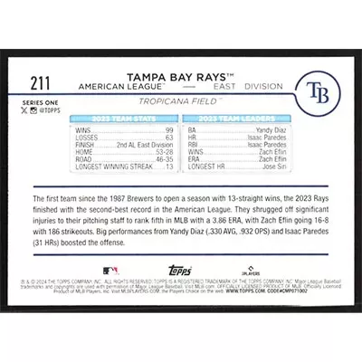 This is a 2024 Topps Tampa Bay Rays baseball card. The card is #211 and pictures show condition.