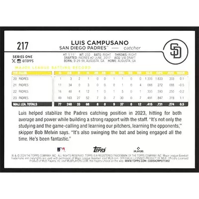 This is a 2024 Topps Luis Campusano baseball card. The card is #217 and pictures show condition.