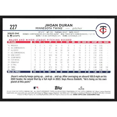 This is a 2024 Topps Jhoan Duran baseball card. The card is #227 and pictures show condition.