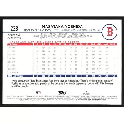 This is a 2024 Topps Masataka Yoshida baseball card. The card is #228 and pictures show condition.