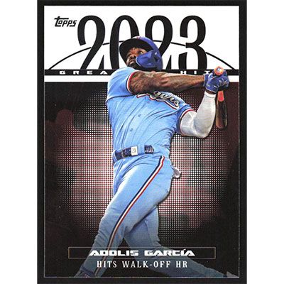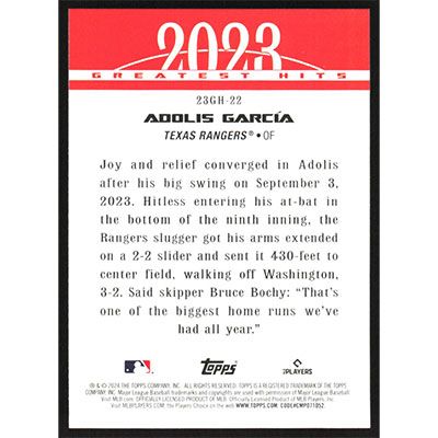 This is a 2024 Topps '23 Greatest Hits Adolis Garcia baseball card. The card is #23GH-22 and pictures show condition.