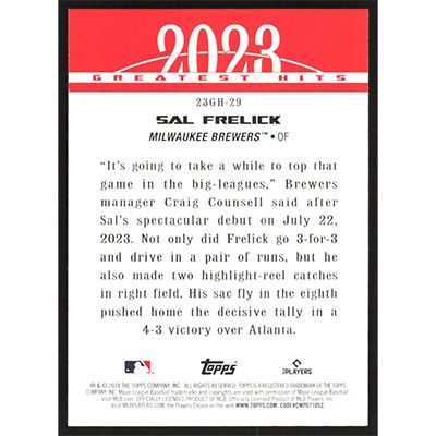 This is a 2024 Topps '23 Greatest Hits Sal Frelick baseball card. The card is #23GH-29 and pictures show condition. Team(s): Milwaukee Brewers Rookie Card (RC)