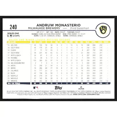 This is a 2024 Topps Andruw Monasterio baseball card. The card is #240 and pictures show condition.