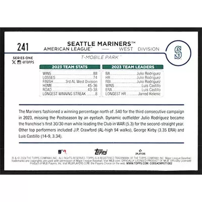 This is a 2024 Topps Seattle Mariners baseball card. The card is #241 and pictures show condition.