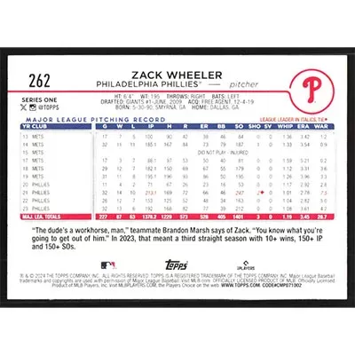 This is a 2024 Topps Zack Wheeler baseball card. The card is #262 and pictures show condition.