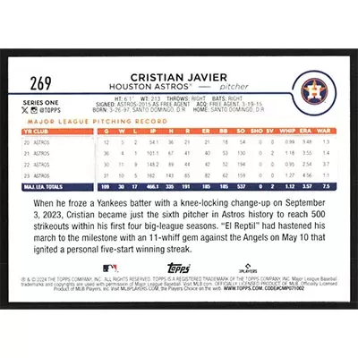 This is a 2024 Topps Cristian Javier baseball card. The card is #269 and pictures show condition.