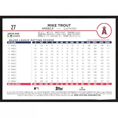 This is a 2024 Topps Mike Trout baseball card. The card is #27 and pictures show condition.