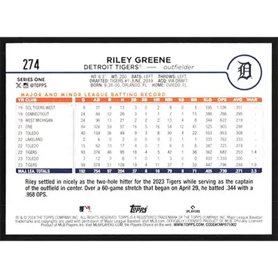 This is a 2024 Topps Riley Greene Future Stars baseball card. The card is #274 and pictures show condition.