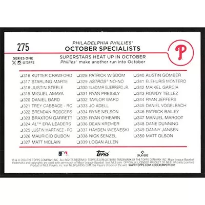 This is a 2024 Topps Bryce Harper and Kyle Schwarber Checklist baseball card. The card is #275 and pictures show condition. Team(s): Philadelphia Phillies