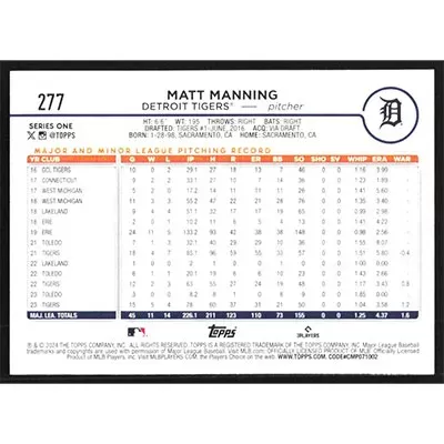This is a 2024 Topps Matt Manning baseball card. The card is #277 and pictures show condition.