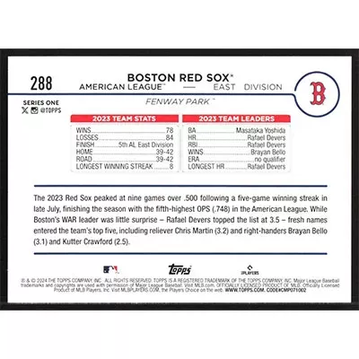 This is a 2024 Topps Boston Red Sox baseball card. The card is #288 and pictures show condition.