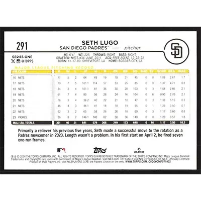 This is a 2024 Topps Seth Lugo baseball card. The card is #291 and pictures show condition.