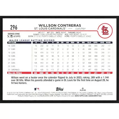 This is a 2024 Topps Willson Contreras baseball card. The card is #296 and pictures show condition.