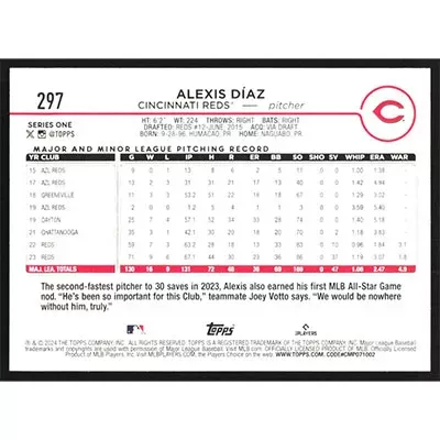 This is a 2024 Topps Alexis Diaz baseball card. The card is #297 and pictures show condition.