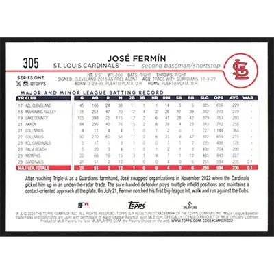 This is a 2024 Topps Jose Fermin baseball card. The card is #305 and pictures show condition.